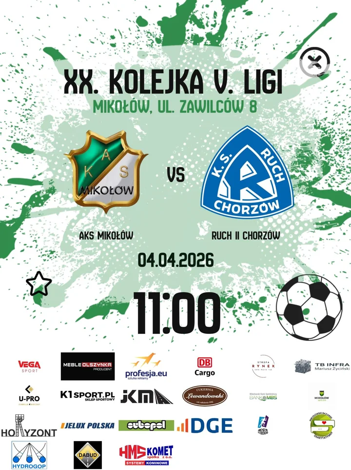 AKS Mikołów znów zagra u siebie, więc kibice mogą liczyć na typową, lokalną piłkarską sobotę: walka o każdy metr boiska, głośniejsze emocje przy ławkach i sporo dopingu z trybun Rywalem będą rezerwy Ruchu Chorzów, więc spotkanie zapowiada się ciekawie także z perspektywy osób, które śledzą śląski futbol i lubią starcia z „charakterem”.