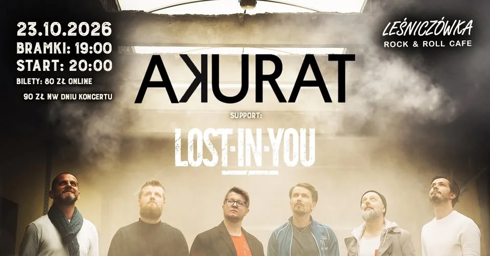 Przed AKURAT zagra LOST IN YOU – rockowy skład z Radomia, założony w 2023 roku przez muzyków dobrze znanych fanom cięższego brzmienia. Zespół ma już na koncie kilka singli, które mocno przebiły się w rockowych rozgłośniach, a ich utwory zwracały uwagę także przy okazji działań związanych z tematyką zdrowia psychicznego