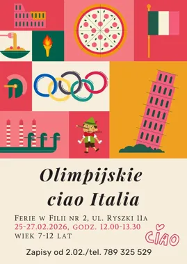 Tegoroczne ferie w bibliotece w Filii nr 2 mają prawdziwie włoski klimat — przeniesienie do kraju, który będzie gospodarzem zimowych igrzysk. Będzie trochę sportowo (zabawy inspirowane zimowymi konkurencjami), trochę literacko (czytanki i opowieści o Włoszech) i dużo twórczości — warsztaty plastyczne i zadania kreatywne dostosowane do dzieci.