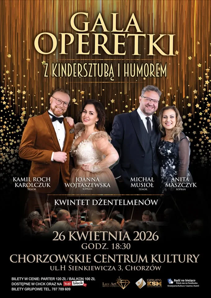Chorzów szykuje wieczór, który ma wszystko: operetkowy błysk, dużo wdzięku, lekkość sceny i solidną porcję dobrego humoru To propozycja dla tych, którzy lubią eleganckie koncerty, ale bez sztywnej atmosfery — z żywym śpiewem, kostiumami i prawdziwą sceniczną energią. Warto zarezerwować sobie ten termin na wyjątkowy muzyczny wieczór.